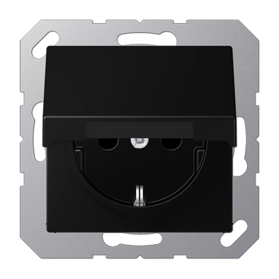 Stopcontact met beschermingscontact (randaarde), Safety+ (kinderbeveiliging) en klapdeksel (terugverend). Bedrading aansluiten met insteekklemmen (aders tot 2,5 mm²). Gemaakt van slagvast, mat gelakt thermoplast. Exclusief afdekraam. Serie: A-range, kleur: grafietzwart mat.