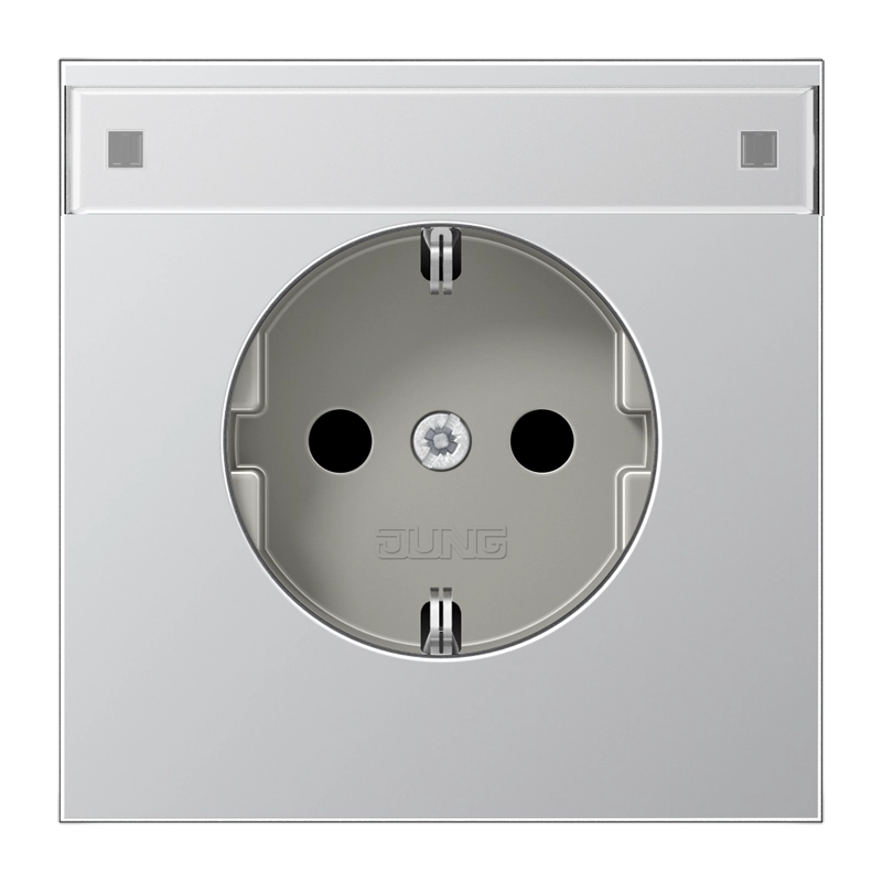 Stopcontact met beschermingscontact (randaarde) en tekstvenster (9 x 58 mm). Draagring is aangesloten op de aardverbinding. Bedrading aansluiten met insteekklemmen (aders tot 2,5 mm²). Exclusief afdekraam. Serie: LS 990, kleur: aluminium (metaaluitvoering).