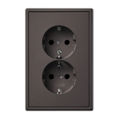 Stopcontact 2-voudig 'vlak' met beschermingscontact (randaarde), Safety+ (kinderbeveiliging) en geïntegreerd afdekraam. Geschikt voor een anderhalve (ovale) inbouwdoos. Bedrading aansluiten met insteekklemmen (aders tot 2,5 mm²). Gelakt Duroplast: zeer krasvast. Serie: LS 990, kleur: dark gelakt aluminium.