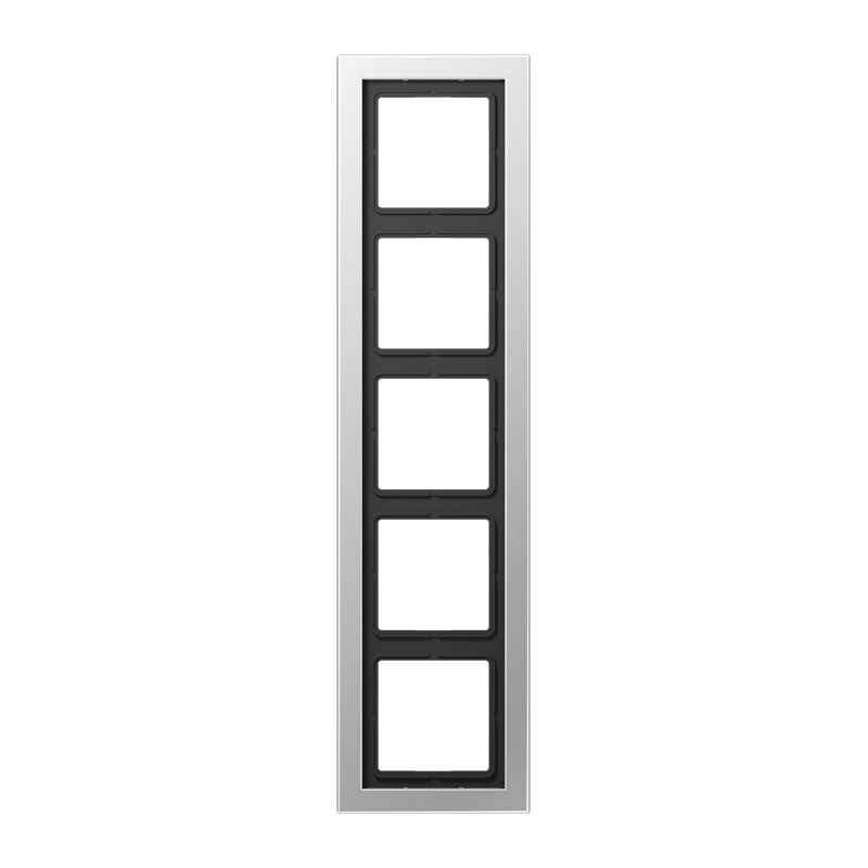 Vijfvoudig afdekraam, voor horizontale en verticale montage. Een opstaande rand aan de achterzijde creëert een subtiele schaduwrand en een zwevend effect voor schakelaars/contactdozen. Afmetingen: 96 x 380 x 11 mm. Gemaakt van gelakt Duroplast: zeer krasvast. Serie: LS DESIGN, kleur: aluminium.