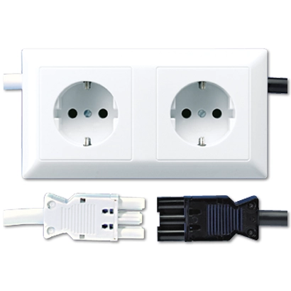 Stopcontact 2-voudig met beschermingscontact (randaarde) en geïntegreerd afdekraam. Alleen geschikt voor een wandgoot. Voorzien van wielandsnoeren (3 x 2,5 mm², Iengte 2 x 1 m extern) en Stago 3000 inbouwdoos. Duroplast: zeer krasvast en glanzend. Serie: AS 500, kleur: alpine wit.