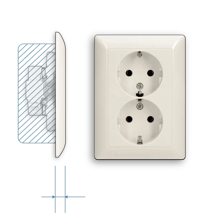 Stopcontact 2-voudig 'vlak' met beschermingscontact (randaarde) en geïntegreerd afdekraam. Geschikt voor een anderhalve (ovale) inbouwdoos. Bedrading aansluiten met insteekklemmen (massieve aders tot 2,5 mm²). Gemaakt van Duroplast: zeer krasvast en glanzend. Serie: AS 500, kleur: crème.