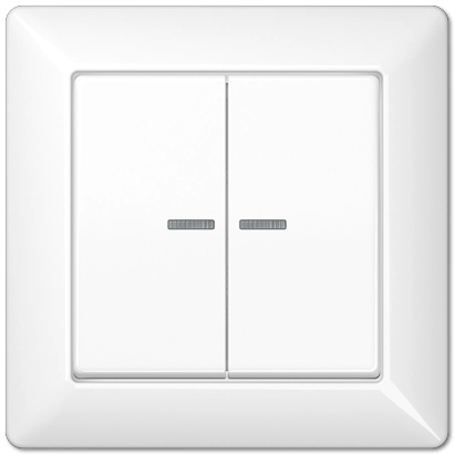 Tweevoudige schakelwip (knop) met controlevenster en afdekraam. Alleen geschikt voor enkele (standalone) montage. Geschikt voor serieschakelaar, wissel-/wisselschakelaar en serie-pulsdrukker (voorzien van verlichting). Gemaakt van Duroplast: zeer krasvast en glanzend. Inclusief klemstuk (montageframe) AS 90-5 HP en afdekraam, exclusief binnenwerk. Serie: AS 500, kleur: alpine wit.