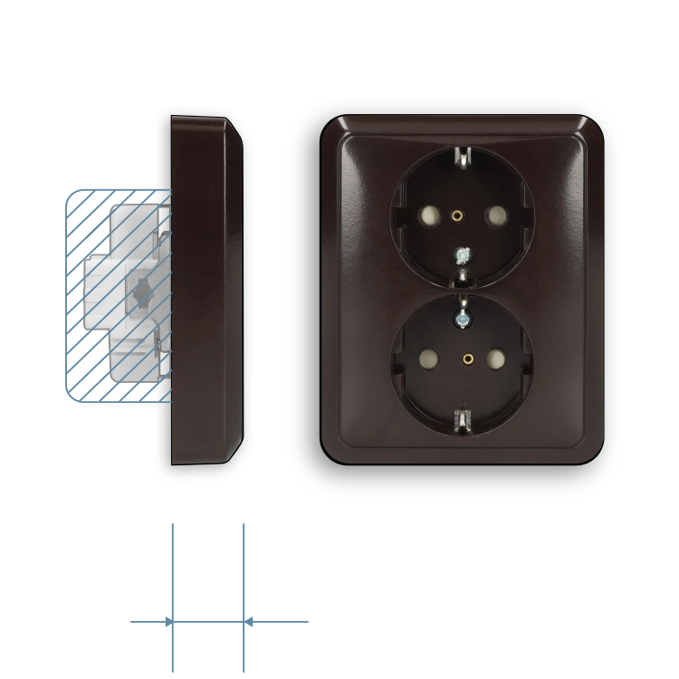 Stopcontact 2-voudig met beschermingscontact (randaarde), Safety+ (kinderbeveiliging) en geïntegreerd afdekraam. Geschikt voor een enkele (ronde) inbouwdoos. Bedrading aansluiten met insteekklemmen (aders tot 2,5 mm²). Gemaakt van Duroplast: zeer krasvast en glanzend. Afmetingen (b x h): 81 x 100 mm. Serie: CD 500, kleur: bruin.