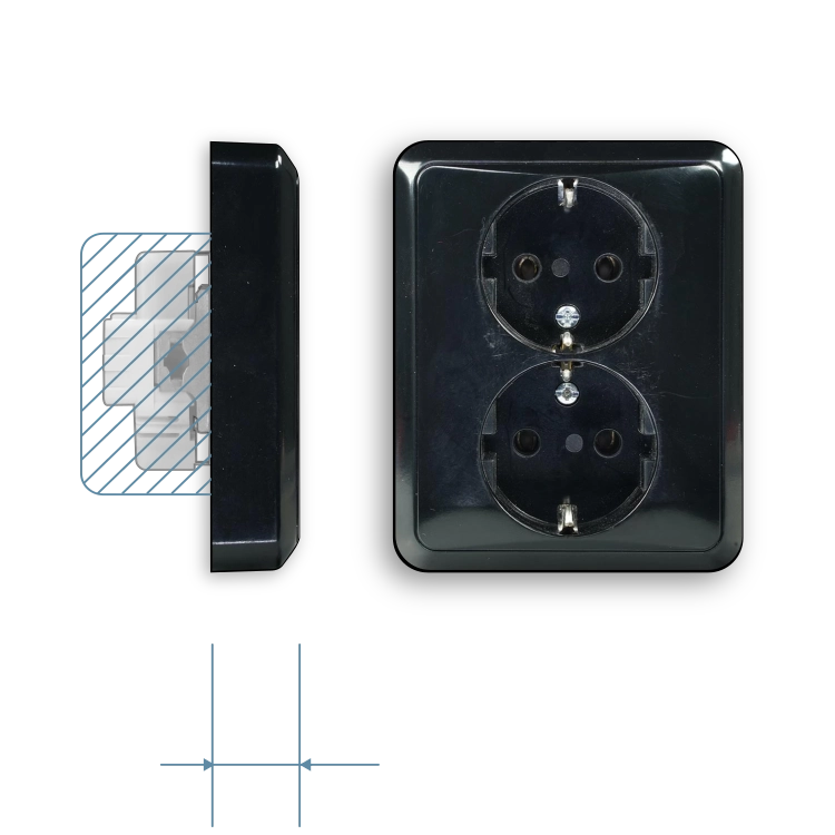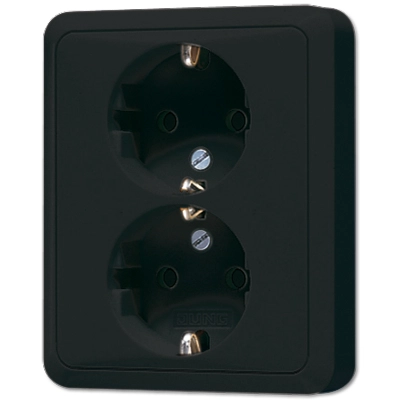 Stopcontact 2-voudig met beschermingscontact (randaarde) en geïntegreerd afdekraam. Geschikt voor een enkele (ronde) inbouwdoos. Bedrading aansluiten met insteekklemmen (aders tot 2,5 mm²). Gemaakt van Duroplast: zeer krasvast en glanzend. Afmetingen (b x h): 81 x 100 mm. Serie: CD 500, kleur: zwart.