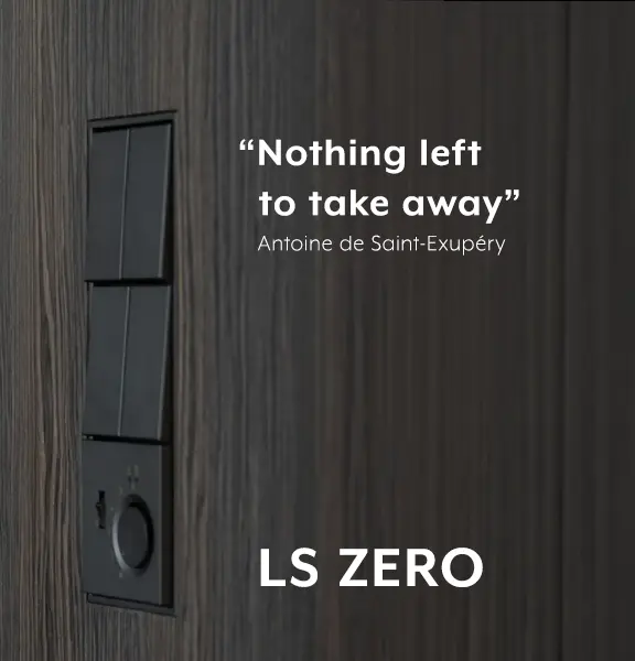 De LS ZERO gaat een stap verder: het schakelmateriaal wordt niet óp de wand gemonteerd, maar volledig ín het wandoppervlak geïntegreerd. Het resultaat is een naadloze overgang tussen afdekraam en wand of meubeloppervlak. Kiest u voor een zichtbare maar elegante schakelaar, dan is de LS 990 een uitstekende keuze. Zoekt u een zo onzichtbaar mogelijke oplossing die volledig opgaat in de architectuur, dan is de LSZERO de aangewezen serie.
