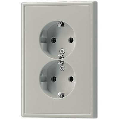 Stopcontact 2-voudig 'vlak' met beschermingscontact (randaarde) en geïntegreerd afdekraam. Geschikt voor een anderhalve (ovale) inbouwdoos. Bedrading aansluiten met insteekklemmen (aders tot 2,5 mm²). Gelakt Duroplast: zeer krasvast. Serie: LS 990, kleur: edelstaal.