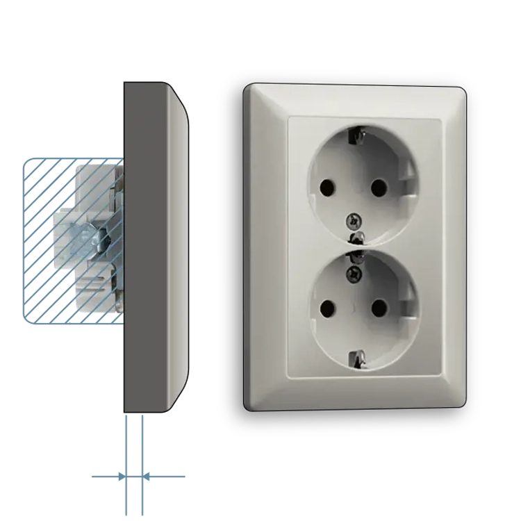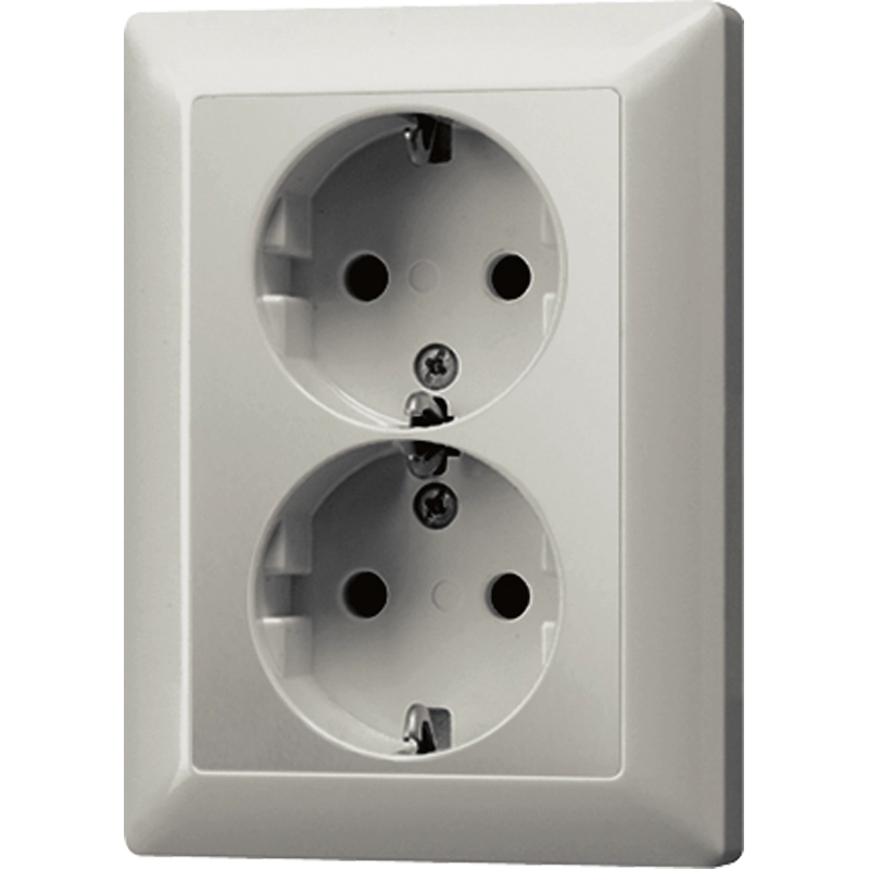 Stopcontact 2-voudig met beschermingscontact (randaarde), Safety+ (kinderbeveiliging) en geïntegreerd afdekraam. Geschikt voor een enkele (ronde) inbouwdoos. Bedrading aansluiten met insteekklemmen (aders tot 2,5 mm²). Gelakt Duroplast: zeer krasvast. Serie: LS 990, kleur: edelstaal.