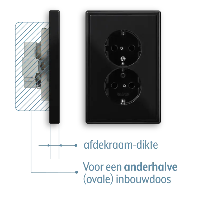 Stopcontact 2-voudig 'vlak' met beschermingscontact (randaarde), Safety+ (kinderbeveiliging) en geïntegreerd afdekraam. Geschikt voor een anderhalve (ovale) inbouwdoos. Bedrading aansluiten met insteekklemmen (aders tot 2,5 mm²). Duroplast (mat gelakt): zeer krasvast. Serie: LS 990, kleur: zwart.