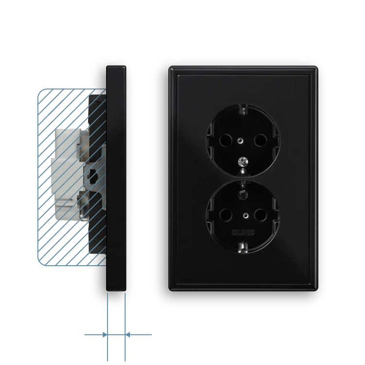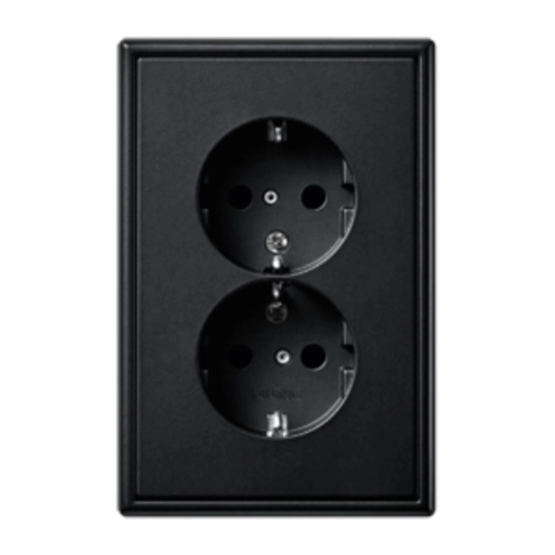 Stopcontact 2-voudig 'vlak' met beschermingscontact (randaarde), Safety+ (kinderbeveiliging) en geïntegreerd afdekraam. Geschikt voor een anderhalve (ovale) inbouwdoos. Bedrading aansluiten met insteekklemmen (aders tot 2,5 mm²). Duroplast (mat gelakt): zeer krasvast. Serie: LS 990, kleur: grafietzwart mat.