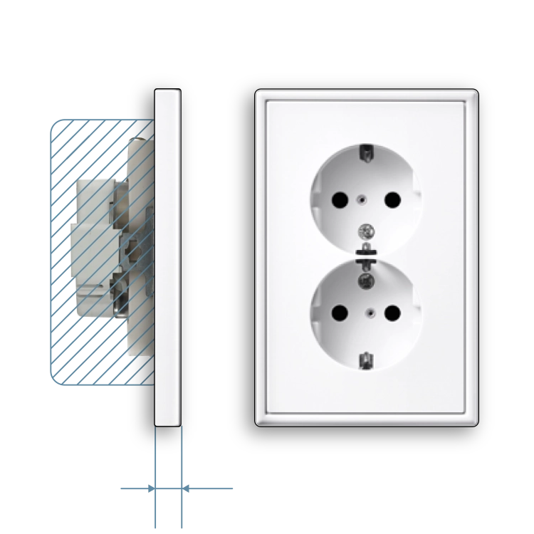Stopcontact 2-voudig 'vlak' met beschermingscontact (randaarde), Safety+ (kinderbeveiliging) en geïntegreerd afdekraam. Geschikt voor een anderhalve (ovale) inbouwdoos. Bedrading aansluiten met insteekklemmen (aders tot 2,5 mm²). Duroplast (mat gelakt): zeer krasvast. Serie: LS 990, kleur: sneeuwwit mat.