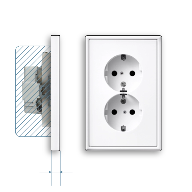 Stopcontact 2-voudig 'vlak' met beschermingscontact (randaarde) en geïntegreerd afdekraam. Geschikt voor een anderhalve (ovale) inbouwdoos. Bedrading aansluiten met insteekklemmen (aders tot 2,5 mm²). Duroplast: zeer krasvast en glanzend. Serie: LS 990, kleur: alpine wit.