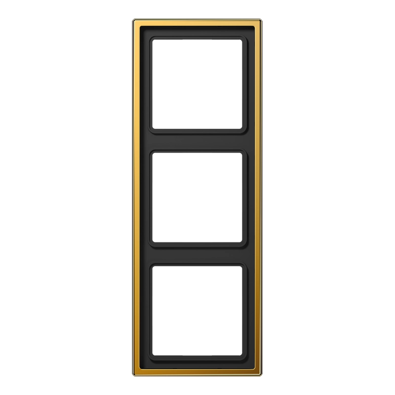 Drievoudig afdekraam, geschikt voor horizontale en verticale montage. Afmetingen: 81 × 223 × 11 mm. Metaaluitvoering (messing), voorzien van een 2 µ dikke vergulde coating. Serie: LS 990, kleur: verguld. Meer informatie »