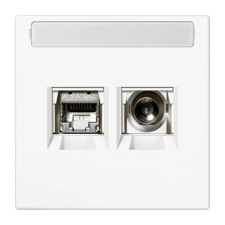 De JUNG LS 990 communicatie wandcontactdoos heeft een RJ45-aansluitpunt Cat.6A en COAX aansluiting om netwerkverbinding te maken voor telefonie, ethernet, IP of internettoepassingen. De Smart-TV aansluitdoos vormt één wandcontactdoos op maat voor de digitale televisiekijker. Zo bespaart u met deze handige Smart-TV aansluitdoos op ruimte, installatietijd en bekabeling.
