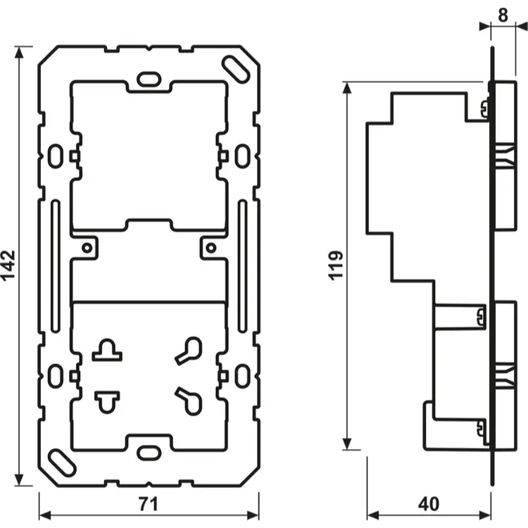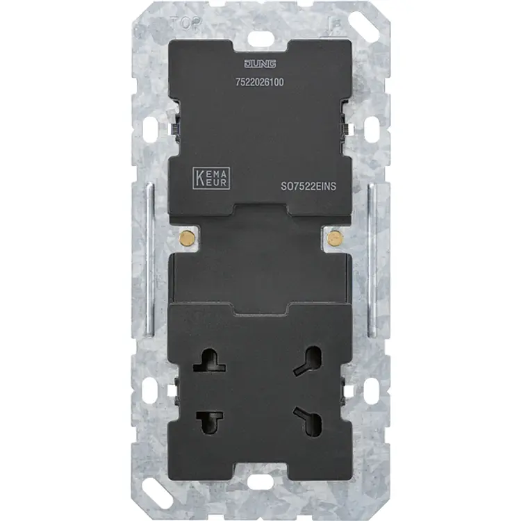De contactdoos is geschikt voor steker US NEMA-1 met 2 pennen en voor een eurostekker. Voor de montage zijn passende dozen art.nr. 9062-02 en 1656-21 genoemd, zodat dit JUNG-basiselement binnen de beoogde inbouwoplossing kan worden toegepast.